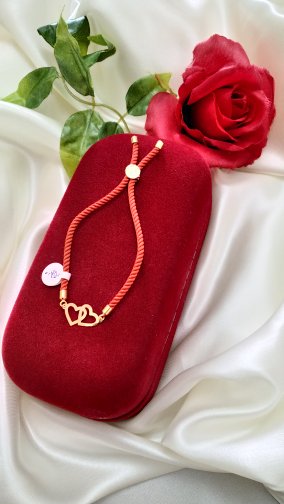 دستبند با پلاک طلا دو قلب و بند ابریشمی کشوئی قرمز رنگ قابل تنظیم برای هر اندازه ی دور مچ دست